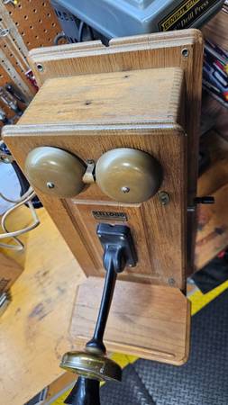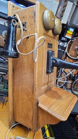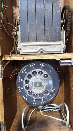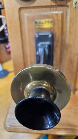 Antique Kellogg wall-mount telephone in working condition. It has a rotary dial inside making this a phone that you can actually use on a land line. See pics for details. Overall good condition for an item of this age and use. Note hand/ear piece has a repaired crack but is operational. I do not respond to "is it available. If you see the phone add, it is available. Thanks!