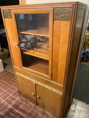 This is an antique or vintage hutch (or whatever it might be called). It is made of real wood with a glass front panel to display the contents of the upper portion. This belonged to my grandparents.
