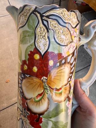 Royal Nippon porcelain decanter pitcher or tall vase originating from Japan between 1891-1921. Hand painted butterly design embellished with enameled accents and gold trim, between 12-13" tall. Base...