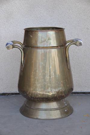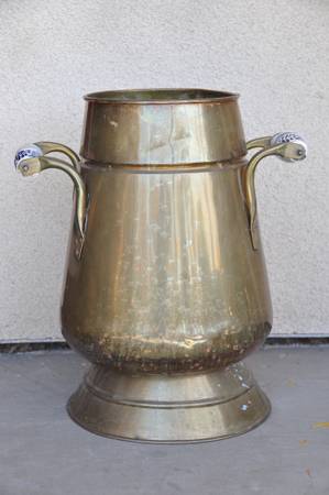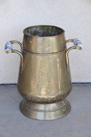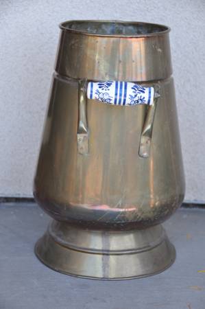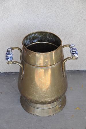 ITEM LOCATED IN SAN JOSE. This is a large brass vessel which originally was most likely used by the fireplace as a coal scuttle or ash bin, and could still serve that purpose today. However, in a modern home it would make an excellent decorative or accent piece for the entranceway/doorway. It can also be used a an umbrella stand. It has two handles on each side made of solid brass tubing and hollow ceramic cylinders. The ceramic has Delft style floral patterns in blue and white. Overall, the item is 18" tall, 16" wide (from handle to handle), 12" deep and weighs about 6 lb. The mouth is about 8.5" in diameter. Asking $125 (OBO).