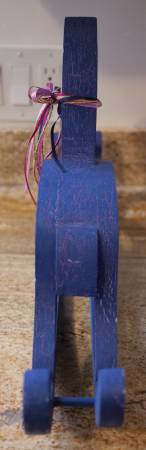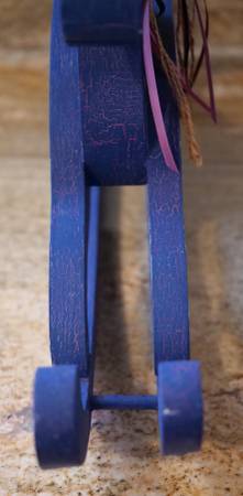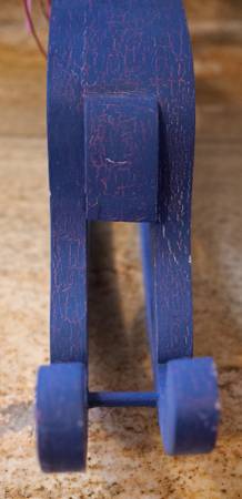 It's made of solid wood, painted with multiple layers of white, red, and blue color. The resulting look is a top vivid blue color with marbled white and red streak below. Please see the pictures for visual details. The toy is in excellent structural, functional, and cosmetic condition.