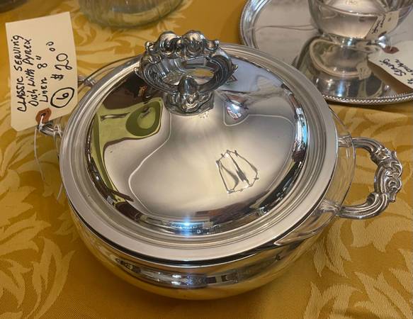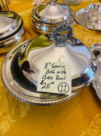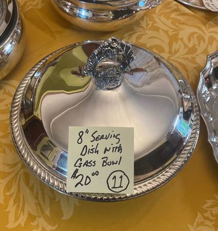 #11)- 8" Silver? Serving dish with glass bowl and cover $20.00
