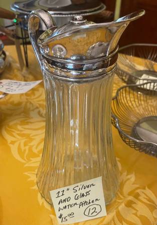 #12)- 11" Silver and glass Water Pitcher $15.00