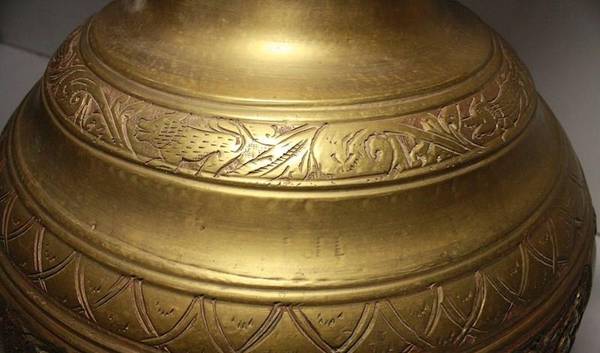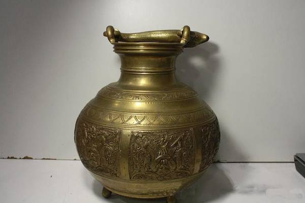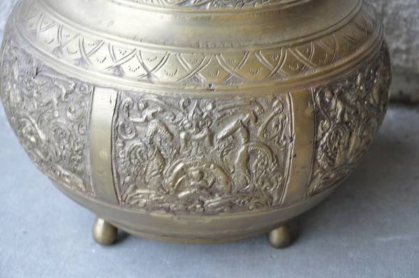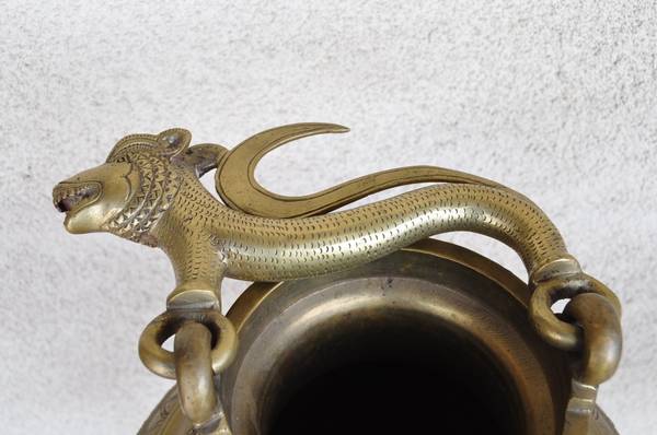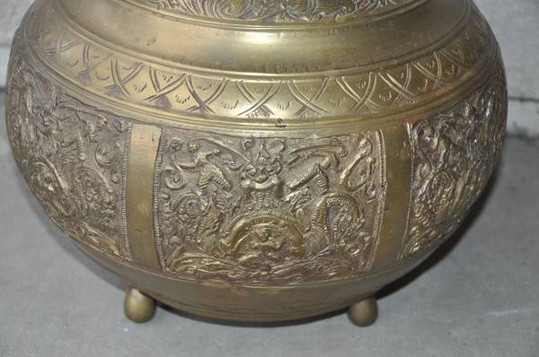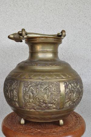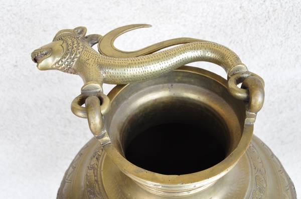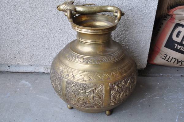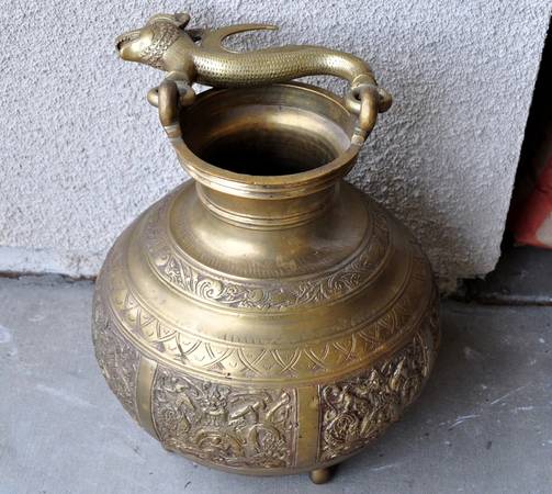 ITEM LOCATED IN SAN JOSE. This is a heavy ceremonial temple water vessel. The solid heavy handle is made in the form of a leopard which is the most interesting aspect of this unique item. The sides of the pot has relief and engraved artwork. The pot is 13" in diameter and 15" high when the handle is down. When the handle is vertical it the item is 20" high. It is heavy and weigh about 22.5 lb and is raised on four ball feet. Asking $750 (Or make offer).