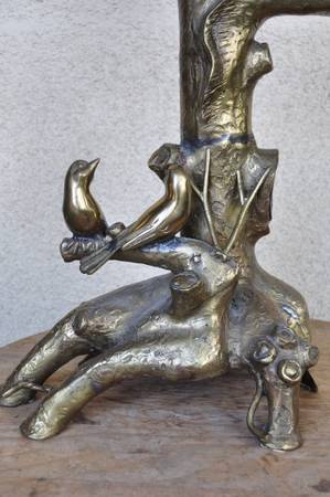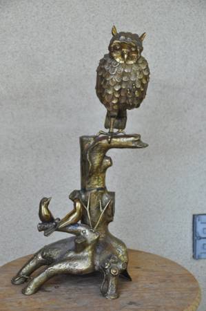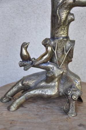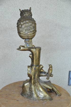 ITEM LOCATED IN SAN JOSE/SANTA CLARA. This is a brass sculpture with an upper branch of a tree stump supporting an owl standing on a single foot, and a lower branch with two perched small birds looking up. The lower part of the stump consists of roots. The owl is removable. In my online research I could not find this particular sculpture. It seems a similar sculpture was used as a table base by the Marbro Lamp Company in the 1950's. Overall, the sculpture is 21" high, 12" wide, 7" deep and weigh about 8.5 lb each. Asking $325 (OBO).