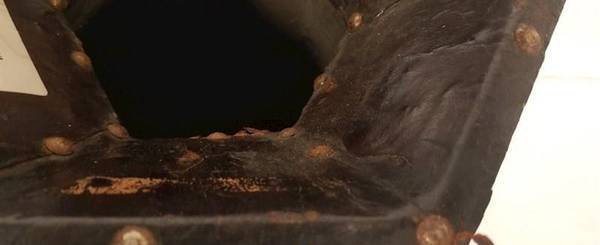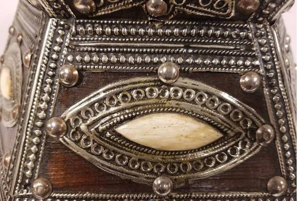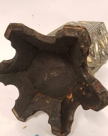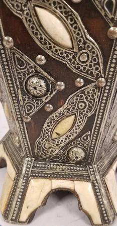 LOCATED IN SAN JOSE. This ornate decorative vase is made of wood on which metal and bone has been inlaid. The cross section is hexagonal in shape all along the height. The opening is decorated with pressed leather. It is 22" high, 11" in diameter and weigh about 9 lb. Asking $450 (OBO).