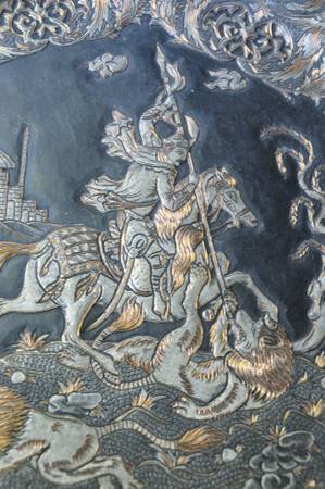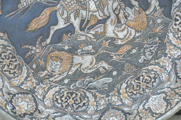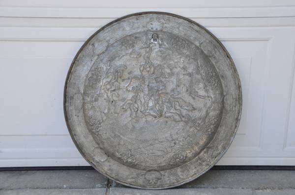 LOCATED IN SAN JOSE. This round wall hanging has repousse features and fine engravings depicting a person on horseback hunting lions, as well as floral features. It is 23" in diameter and weighs 9 lb. Asking $395 (OBO).