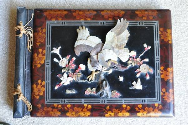 Late 19th C Japanese lacquer photo album with abalone shell eagle...