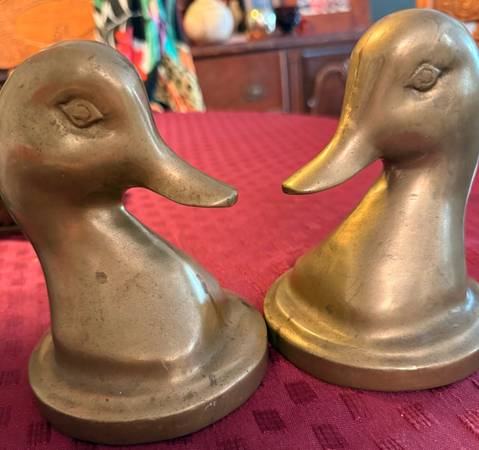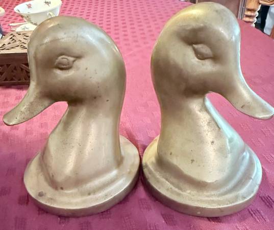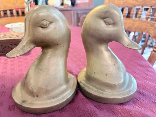 • The bookends feature detailed duck heads, mallards, with eyes, cheeks, and beaks.