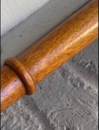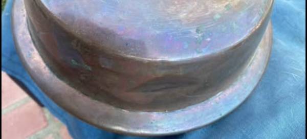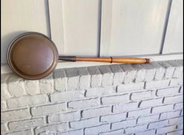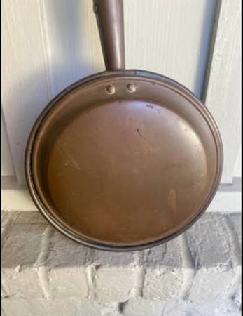 I’m not certain if it’s copper or brass — I think copper? It’s in very nice condition. Wood handle is beautiful. A bit of denting on one side of pan, but not bad. Total length is 35”. Pan width is...