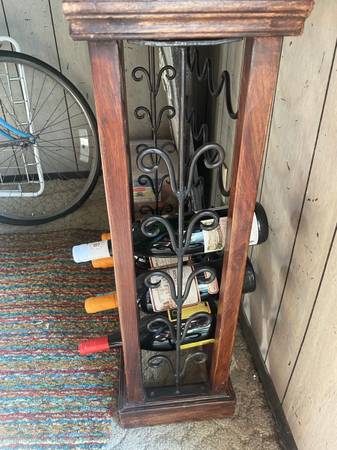 This piece is a wood-and-wrought iron wine rack, freestanding, with a rectangular shape. It looks like it holds about 12 bottles (3 rows of 4). These are popular as decorative but functional furniture, especially in rustic, Tuscan, or traditional styles.