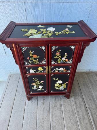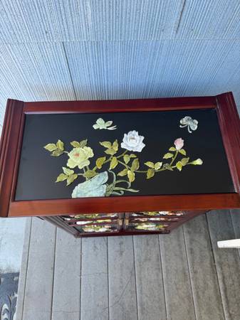 Available is a beautiful vintage Asian Rosewood cabinet featuring intricate hand carved stone accents in relief. It has a storage compartment underneath as well as a glass top to protect the detailed artwork. This will add a touch of elegance to any room. The pictures reflect all sides .