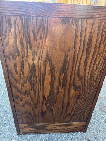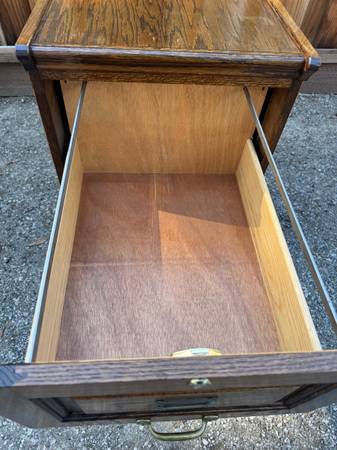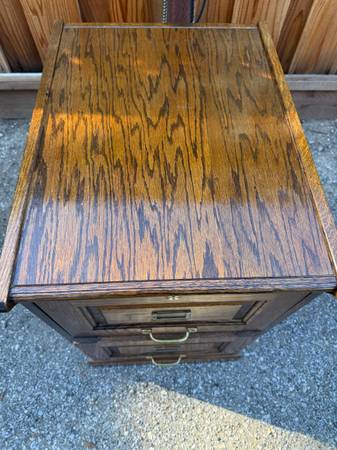 This is a very nice vintage wooden filing cabinet. No keys are available. See pictures for all angles. Measuring; 30 inches tall 18 1/2 inches wide 24 1/2 inches deep Pick up only Price is firm Cash...