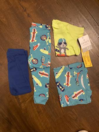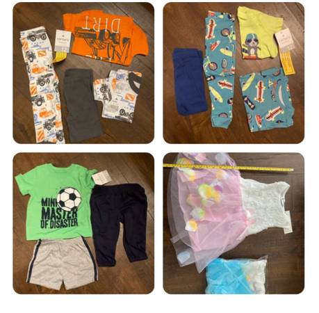All sets are new, never worn Carter Boy 12 month, $10 for all 3 sets Girls flower pedal dresses approx 12 months to 24 month $5 for both dress.
