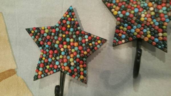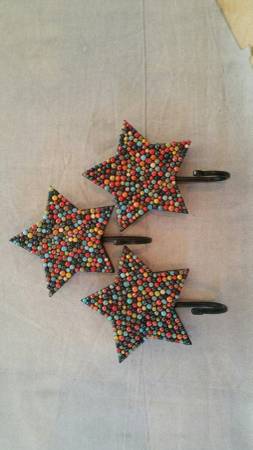 glass star hooks - 7.5 long by 6" wide black iron hooks are 2.5 inches long by 2 inches deep Wooden backs holds baseball caps, and other large items.