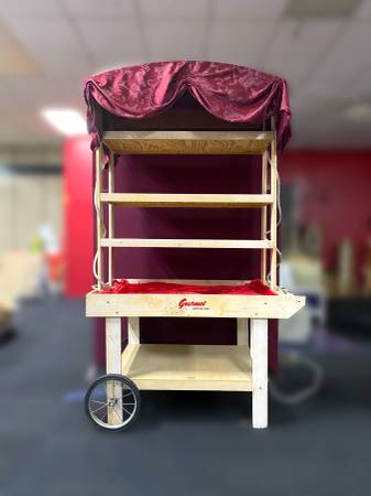 Gourmet Specialties Display Cart in Pine - The cart will need the bolts and nuts tightened after moving it. There is one panel at the back that needs to be glued. Overall the cart is in great condition and during the years it has been a huge focal point for all our seasonal and show stopping displays.