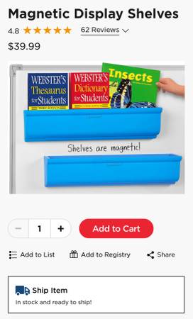 These incredibly sturdy shelves stick to any magnetic surface—making it easy to display books and other classroom materials! Plus, each shelf is extra-deep and super-strong—so even heavy items stay securely in place as you teach! Set comes complete with 2 durable plastic shelves; each measures 18 1/2"w x 2 1/4"d x 4 1/4"h and holds up to 2 1/2 pounds.