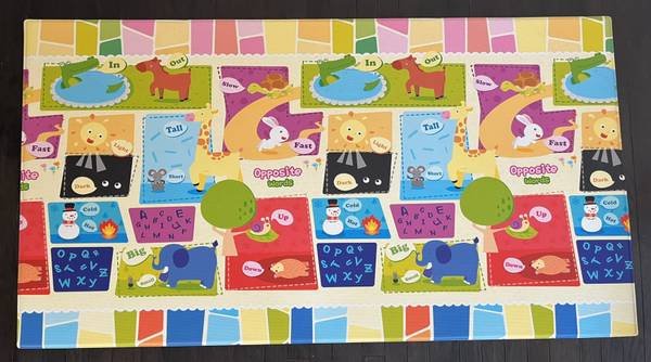 For sale is a beautiful and colorful kid's playmat in excellent condition, perfect for babies and toddlers! This mat features two distinct patterns: a vibrant camping scene on one side with adorable animals like bears, foxes, and otters enjoying activities like canoeing, fishing, and campfires, and another pattern on the back for added variety.