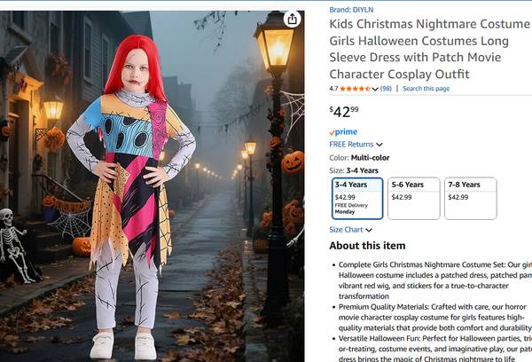 Like New SZ Small (3-4) Gril Kids Christmas Nightmare Halloween Costumes Long Sleeve Dress Movie Character Cosplay Outfit Size Small (3-4) - 818882