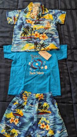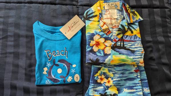 For sale are a set of brand new Hawaii shorts and shirt set and a new still with tag T-shirt. Asking $8 for the set and $4 for the T-shirt. When buying both, the price is $10 for the shorts set and T-shirt.