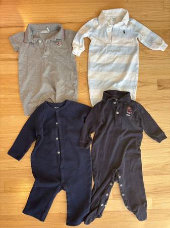 1. Ralph Lauren Polo Long sleeve navy 9 months 2. Ralph Lauren long sleeve baby blue / white stripes 6 months 3. Ralph Lauren navy no collor 9 months $5 each The moncler has been sold