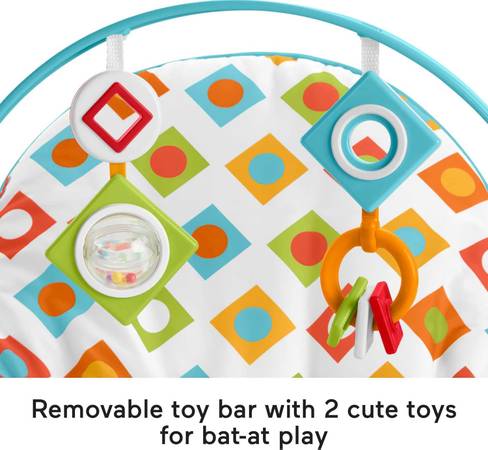 - Adjustable seat recline and removable toy bar with 2 bat at toys