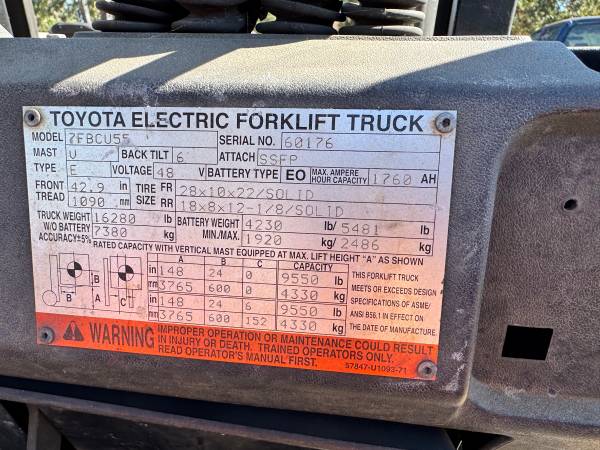 12,000 lbs lift capacity class 2013 Toyota Electric Forklift for sale with good battery condition. Automatic Transmission. The lift go up to 13 feet high. It has side shift, tilt back and forth, and fork can swing in an swing out.