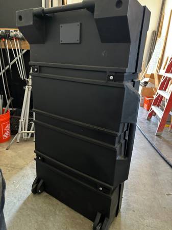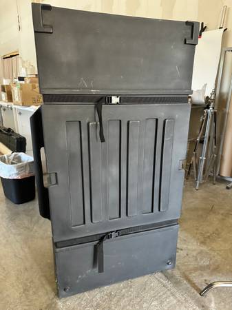 We have TWO identical podiums that have only been used once. They are the dark brown/mahogany color. There is ONE hard case with wheels as well. These are from a video studio and were used as props only.