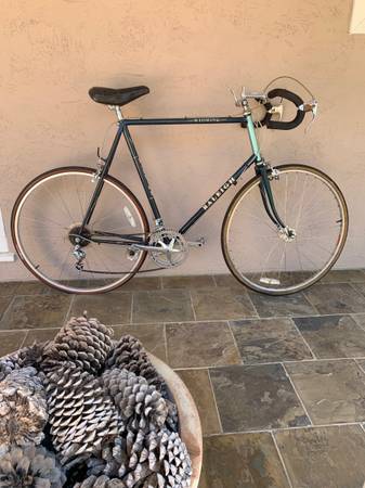 I am selling a VINTAGE 1980's RALEIGH WYOMING TOURING 12-SPEED ROAD BIKE SIZE 25.5”/64 cm. This all original road bike is in excellent condition and was fully refurbished. It was just serviced professionally and everything was adjusted lubed, greased, tuned and trued. As part of the service, the bike has brand new rear tire tube. The bike has the the Suntour Rear and Front Derailluers and Index Shifters. It has Dia-Compe front and rear brake levers and brake calipers. The bike has the Araya Raleigh 27 1 1/4 wheelset with Raleigh sealed hubs and gumwall tires. It has front wheel quick release skewer. The bike has the Raleigh 555 Chromoly frame . It is green and light green in color. The frame Raleigh embossed on the rear seat stay. Bike has aluminum handlebars with nice padded foam. And it has the Raleigh stem. It has the original Raleigh padded saddle seat, The bike is a size 25.5”when measuring from the center of the crank to the top of the seat tube which makes this a 65cm size bike . I am selling this fully refurbished road bike for $400.00