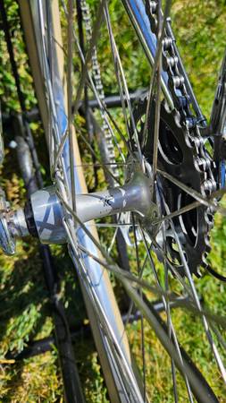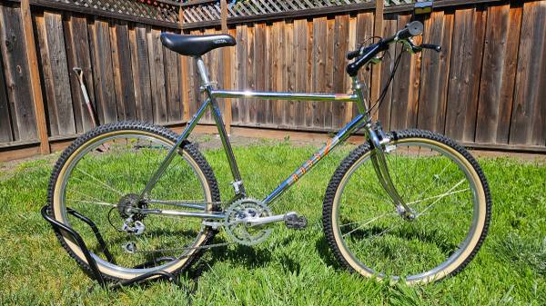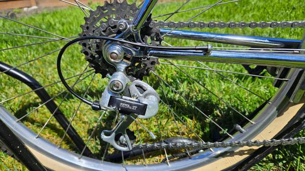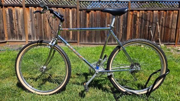 1986 Ross Mt Hood Hi-Tech in restored condition. Sports triple butted chromoly tube set. Bike was completely disassembled with all bearings cleaned and lubed for many more miles of riding pleasure. New cables and housing along with a new set of Vee Tire Company Terra One tires installed. Most of the components are original to the bike and a few were upgraded, XT rear derailleur and XT thumb shifters for better reliability. This has front and rear roller cam brakes which were only on a few of models so a nice feature. Rims are Arraya RM20 Gold Labels so a nice touch and shiny like the rest of the bike, chrome rules. Crankset is Sakae CR and specked on this model. Original bars and stem are intact and very hard to find on a 28 year old bike. Frame is a large and measures 22" from center of BB to top of the seat tube.
