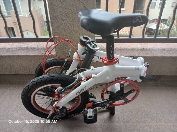 Folding bicycle, 14 inch, suitable for kids and small adults. 20 lbs. Very light. 3 gears. Made in Taiwan.