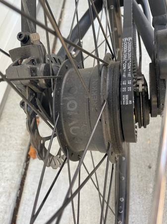 Great commuter bike! Low maintenance gates carbon belt drive, continuously variable internal hub transmission, dynamo front hub and dynamo front and rear lights (front light has a usb port to charge your devices), hydraulic disc brakes.