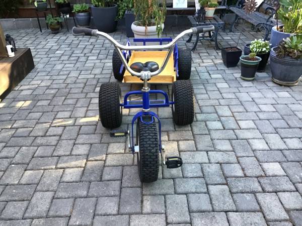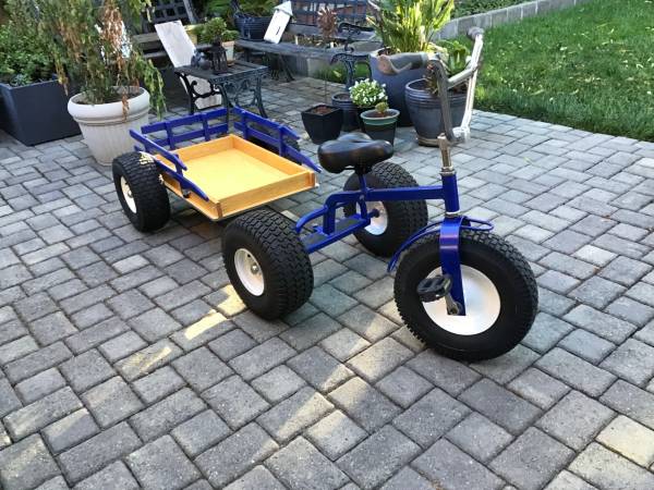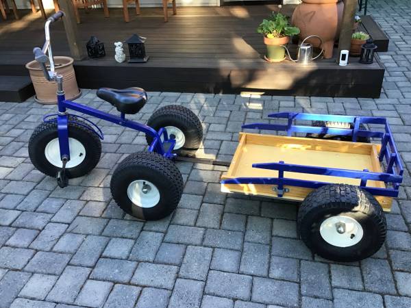 Super cool Sturdy blue tricycle with large tires and wooden trailer. Used by disabled child until he outgrew it. Adjustable seat. Purchased new from ace hardware. Completely restored with new everything including tires, rims. Seat, pedals, grips, bearings, paint, etc.