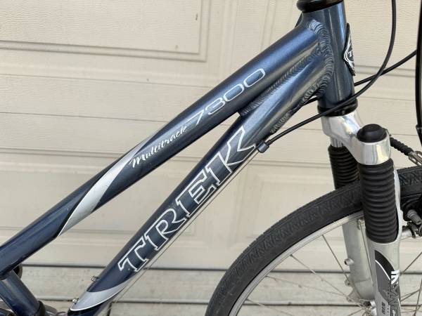 Beautiful Trek Aluminum Mountain bike. Frame paint still has that new shiny glossy luster. Metallic blue color, very attractive. Front suspension, low cross bar, and brand new saddle for comfort.