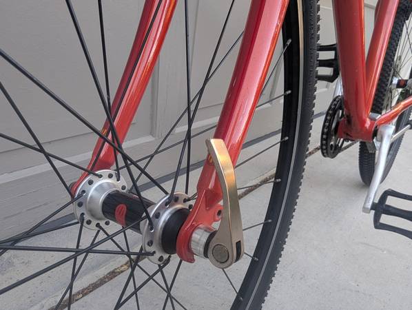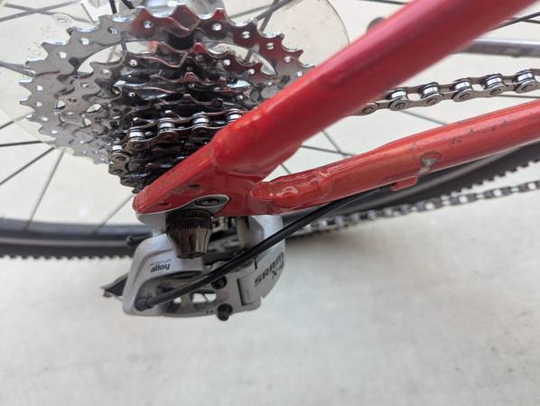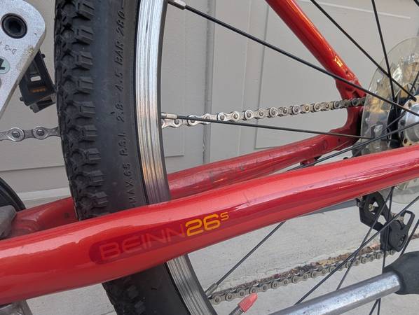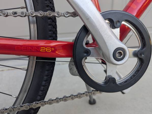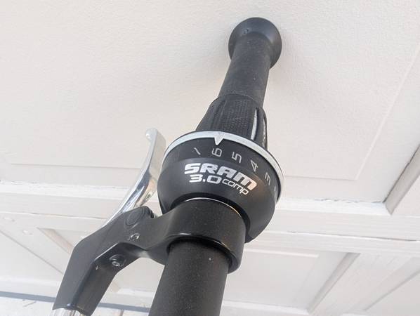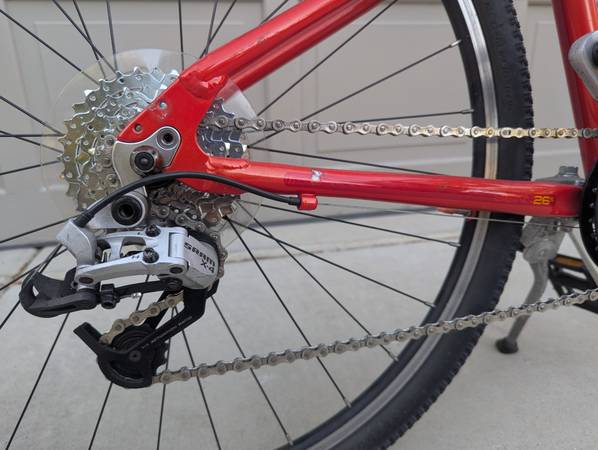26-inch wheels. High-TPI Kenda tires. Quick-release wheels. Lightweight aluminum frame. Front and rear linear brakes (V-brakes). SRAM Comp shifter. Eight gears. SRAM X4 rear derailleur. High-quality, well-made, in excellent condition.