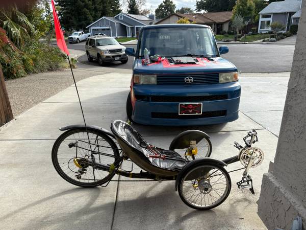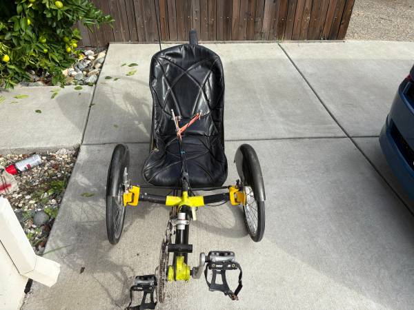 UP FOR SALE IS A HANDBUILT RARE WINDCHEETA RECUMBENT TRIKE SL. MADE IN ENGLAND. HAND MADE ALUMINUM FRAME WITH CARBON FIBER SEAT AND FRONT FENDERS. 20 IN. FRONT WHEELS WITH 26 IN REAR. 27 SPEEDS. DRUM BRAKES. TRIDENT JOYSTICK FOR QUICK STERRING AND GEAR CHANGES WITH HAND BRAKE THIS IS NUMBER 096 EVER BUILT. ONE OF THIS BRAND AND MODEL IS DISPLAYED IN THE SMITHSONIAN MUSEAM. FORMER HOLDER OF MANY RECUMBENT TRIKE SPEED RECORDS. WAS MADE BY MR. MIKE BURROWS IN ENGLAND, WHO ALSO DESIGNED CARBON FIBER ROAD BIKES FOR TREK AT ONE TIME. SIZE MEDIUM. FAST AND QUICK TRIKE AND RIDES NICE. NO MECHANICAL ISSUES, 1500.00 SERIOUS ONLY. NO SCAMMERS OR LOW-BALL OFFERS. THANKS.