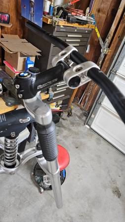 The Ultimate Peddling Machine, 2000 BMW full suspension frame/fork in great condition. If you are looking for a unique bike to build up this is for you. There were only a handful of these that were made/sold by BMW that had disc only fork, rear will accept disc or V-brake if you get the brake bosses. The frame design is off of their motorcycles in that era and works well for soaking up the terrain. Stem and bars are adjustable to fit your preferred riding position along with the included seat post and binder. The bike will fold up to fit into an M3 or any other BMW by removing the front wheel, pop a quick release and into the trunk it goes. I do have the XTR front derailleur available if you want that as well. I can sell some or all of the other parts if you need something to help with the build.