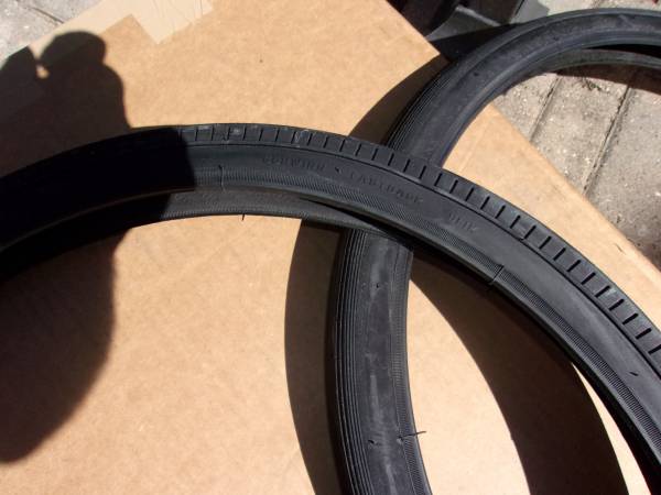 I am firm on this price on these, good price $65 for the set. Schwinn authorized reproduction tires that say Schwinn and Fastback right on them. New, never mounted. Back is the hard to find slik. Got these for a Fastback I sold before tires came, no need for them now. Will sell just rear slik for $45, better off paying $65 for both tires though. I may trade for Schwinn Stingray bikes or parts, depends what you have. I am in San Jose.