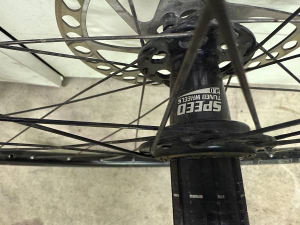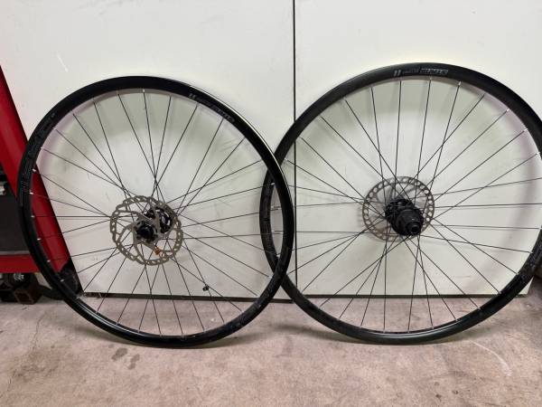 Barely ridden road wheels. Bought these wheels in 2018 and they have been hanging in my garage for at least the last five years. The discs show absolutely no wear. Front and real wheels both have 32 spokes. The hubs are Stan's Speed Tuned 2.0. I am virtually sure based on the age of these wheels that they are 10/11 speed compatible but that should be verified The hubs are thru axle.