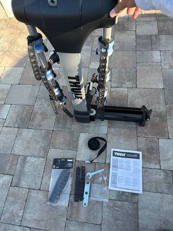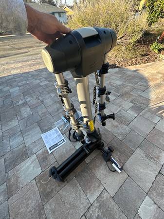 4-bikes capacity Swing Away lockable trailer hitch bike rack (with swing away arm, so you can open SUV back trunk door without having to remove rack and bikes). Includes all original parts and accessories, original keys and locks. Also extra accessories like adapters for children’s bikes and extra rubber straps. Hardly used (about 5 total times used) and like new. Excellent condition!