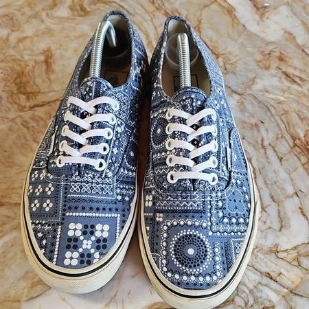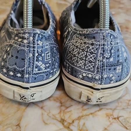 VANS AUTHENTIC Blue Paisley Sneakers Shoes Mens 9.5 or Womens Size 11 Stylish blue sneakers with a unique pattern. Features white laces and a comfortable design.