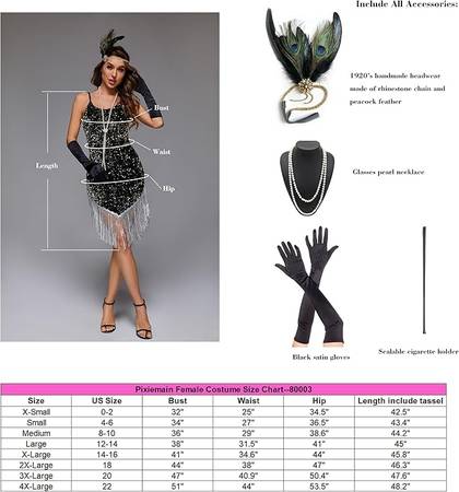 Complete Party Ensemble: This set includes a dazzling party dress and a matching accessories set, Include: glasses pearl necklace, Wet look fabric gloves, Cigarette holder, peacock feather headwear, offering all you need for an authentic and stylish look