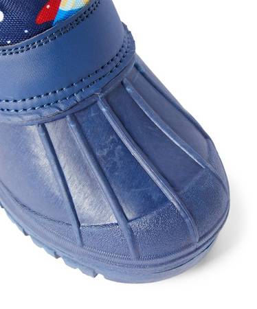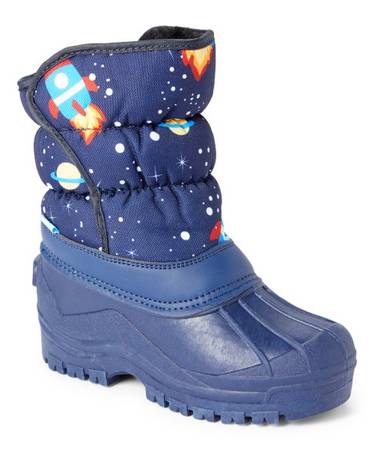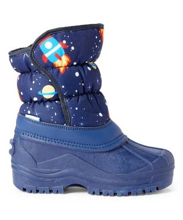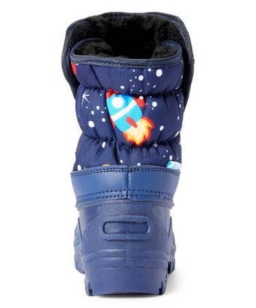 Keep little feet equipped for cold, snowy weather in this thick, Velcro snow boot that sports a fun space-themed print and a thick rubber sole for secure steps.