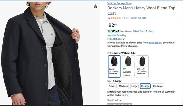 NEW Size XL X-Large Dockers Men Henry Wool Blend Top Coat