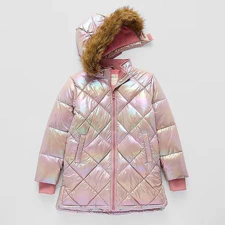 This Thereabouts little and big girls heavyweight water-resistant puffer jacket, available in a beautiful shiny metallic shade, is designed to keep her warm and cozy during the coldest days. It features a faux fur trimmed hood for extra protection against the elements, a full-zip closure at the front, long sleeves, and two side slip pockets, making it a stylish and functional addition to her wardrobe.