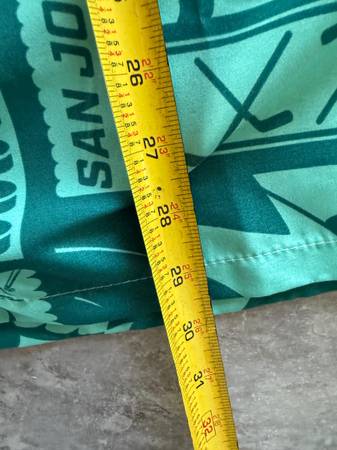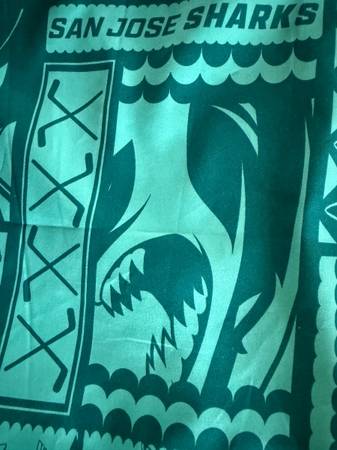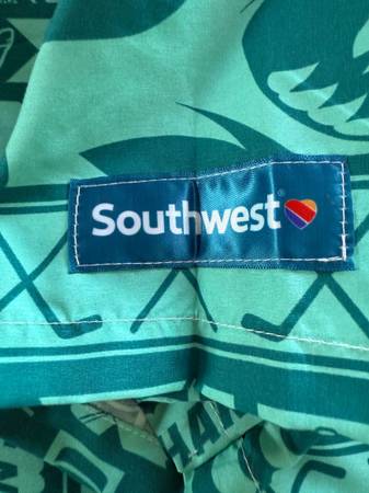 This product is a vintage Hawaiian-themed Southwest Airlines San Jose Sharks button-up shirt in size XL. It features a collared neckline, short sleeves, and a button closure. The shirt is made of polyester and is machine washable, making it ideal for casual occasions in all seasons. The teal color and Hawaiian accents add a fun and tropical touch to this regular fit men's shirt. Perfect for any NHL fan or someone who loves a unique and stylish addition to their wardrobe. The Southwest Airlines Label is on the Sleeve.