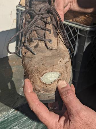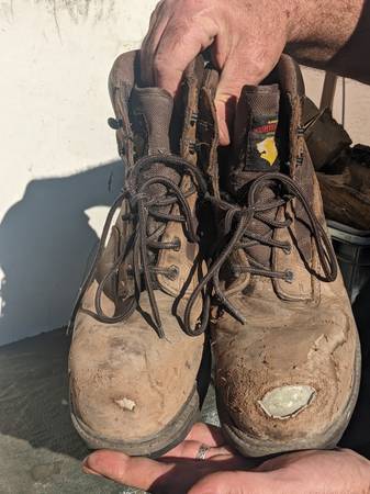 used, mens 10, steel cap toes, for safety...cheap insurance for a job site. Leather on the front toes is a bit chewed up, rest of the boots are fine, soft leather, broken in, ready to wear.