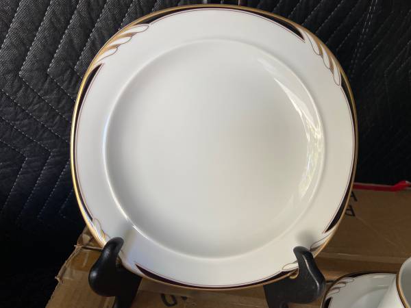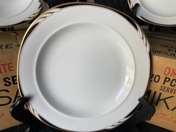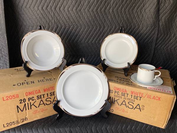 This is a new in two box 40 piece setting of Mikasa Omega fine China dinner ware. This is a discontinued pattern from early 90’s and is known for its elegant white, black and gold rim, making it a sought-after collectible for those who appreciate classic tableware.
