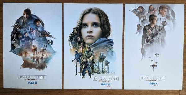 Guaranteed authentic set of 3 posters from 2016. These were offered exclusively at AMC IMAX theaters for showings on December 25, 2016 which I attended and got in person. New condition, never displayed - kept in a plastic container with all my other Star Wars posters all this time - all for sale now. Each poster is 13" x 19".