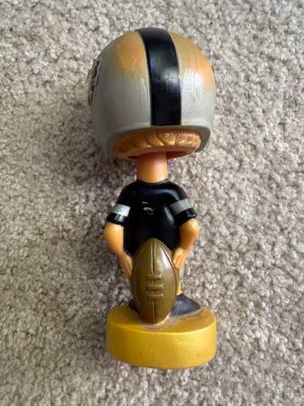 I am selling a VINTAGE 1975 OAKLAND RAIDERS BOBBLEHEAD NODDLER. This vintage Oakland Raiders is in good condition for its age. It is made of hard rubber material. It has yellow spots on the top sides of the helmet. The raiders logos are on both sides of the helmet and the original sticker on the base is still in tact. The base in marked underneath. Please see all pictures to determine condition It measures 1/2" tall. I am selling it for $60.00